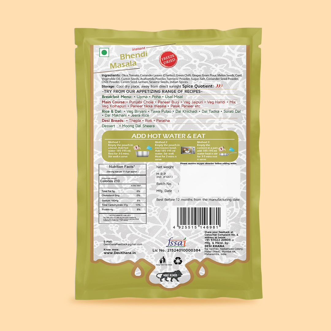 - Ingredients: Okra, Tomato, Coriander Leaves (Cilantro), Green Chili, Ginger, Gram Flour, Melon Seeds, Curd, Edible Vegetable Oil (Sunflower Oil), Cumin Seeds, Asafoetida Powder, Turmeric Powder, Sugar, Salt, Coriander Seed Powder, Chili Powder, Carom Seed, Lemon, Sesame Seeds, Indian Spice Mix.