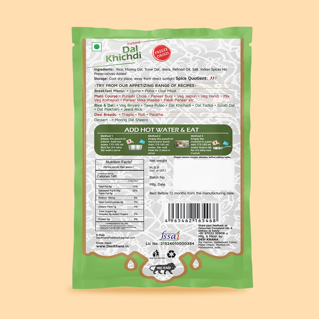 - Ingredients: Rice, Yellow Split Pigeon Peas, Tomato, Cumin Seeds, Clarified Butter (Ghee), Green Chili’s, Coriander Leaves (Cilantro), Turmeric Powder, Edible Vegetable Oil (Sunflower Oil), Salt, Ginger, Asafoetida Powder, Chili Powder, Red Chili.