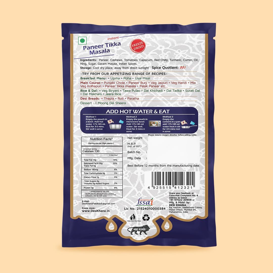 - Ingredients: Tomato, Cottage Cheese (Paneer), Green bell pepper, Ginger, Edible Vegetable Oil (Sunflower Oil), Refined Wheat Flour, Curd, Cashew Nut, Sugar, Salt, Fenugreek leaves, , Chili Powder, Cumin Seeds, Cardamom, Turmeric powder, Indian Spice Mix.